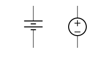 左边的符号用于表示电池。电池符号上的较长水平线代表电池的正极,较短的水平线代表电池的负极。圆圈符号代表其他某个电压源,通常是电源。在圆圈内画上+正号和−负号是一个良好的做法。