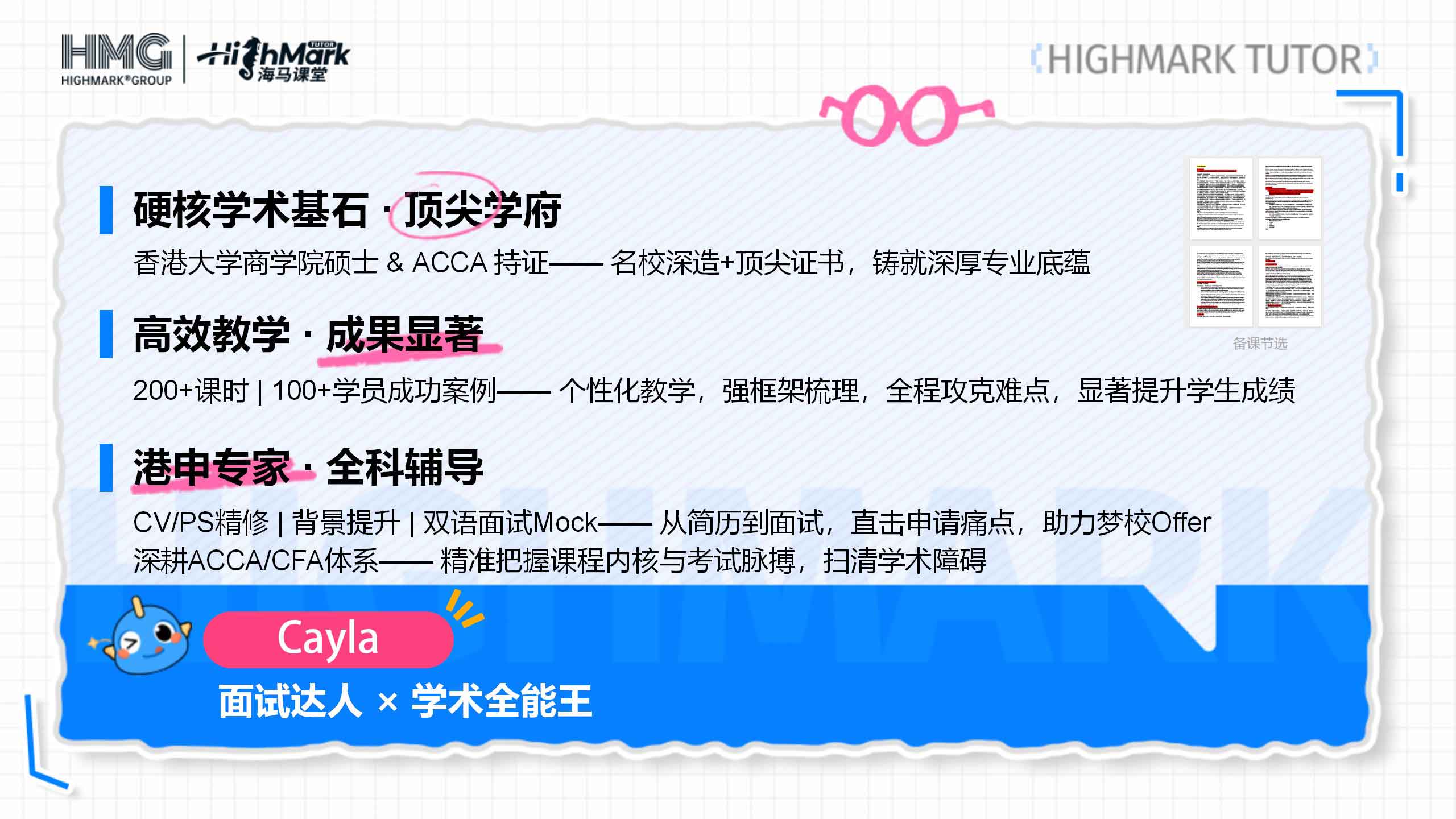 专业背景:香港大学商学院硕士,持ACCA资格证,理论专业度+实操能力双强。