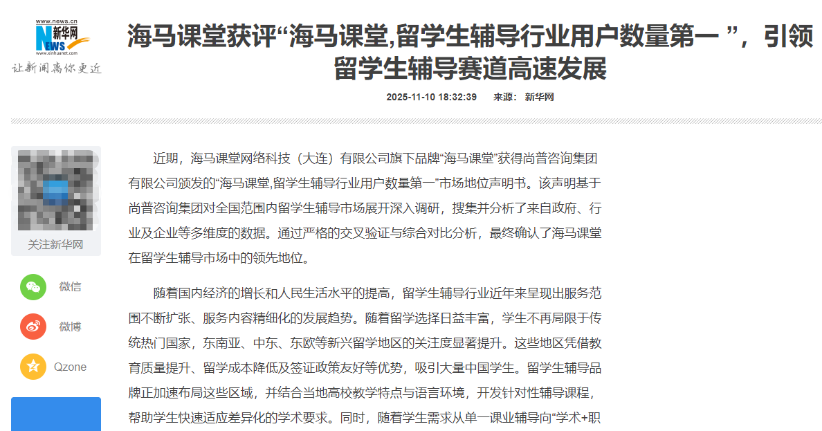 近日,海马课堂再次迎来重要里程碑:凭借卓越的教学实力与持续增长的用户口碑,海马课堂获评“留学生辅导行业用户数量第一”,成为行业发展新标杆。该荣誉由尚普咨询集团有限公司基于对全国留学生辅导市场的系统性调研与多维数据分析正式颁发。消息发布后,在留学辅导行业内引发广泛关注,新华网等权威媒体相继报道与肯定。