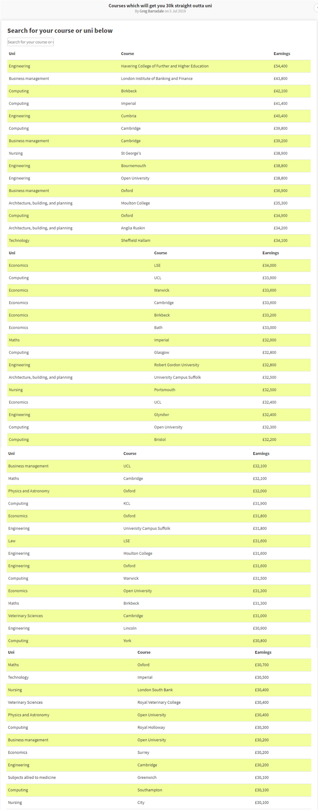 英国学生毕业一年后,年薪中位数超过3万英镑的学校和专业盘点如下:(请放大图片查看)